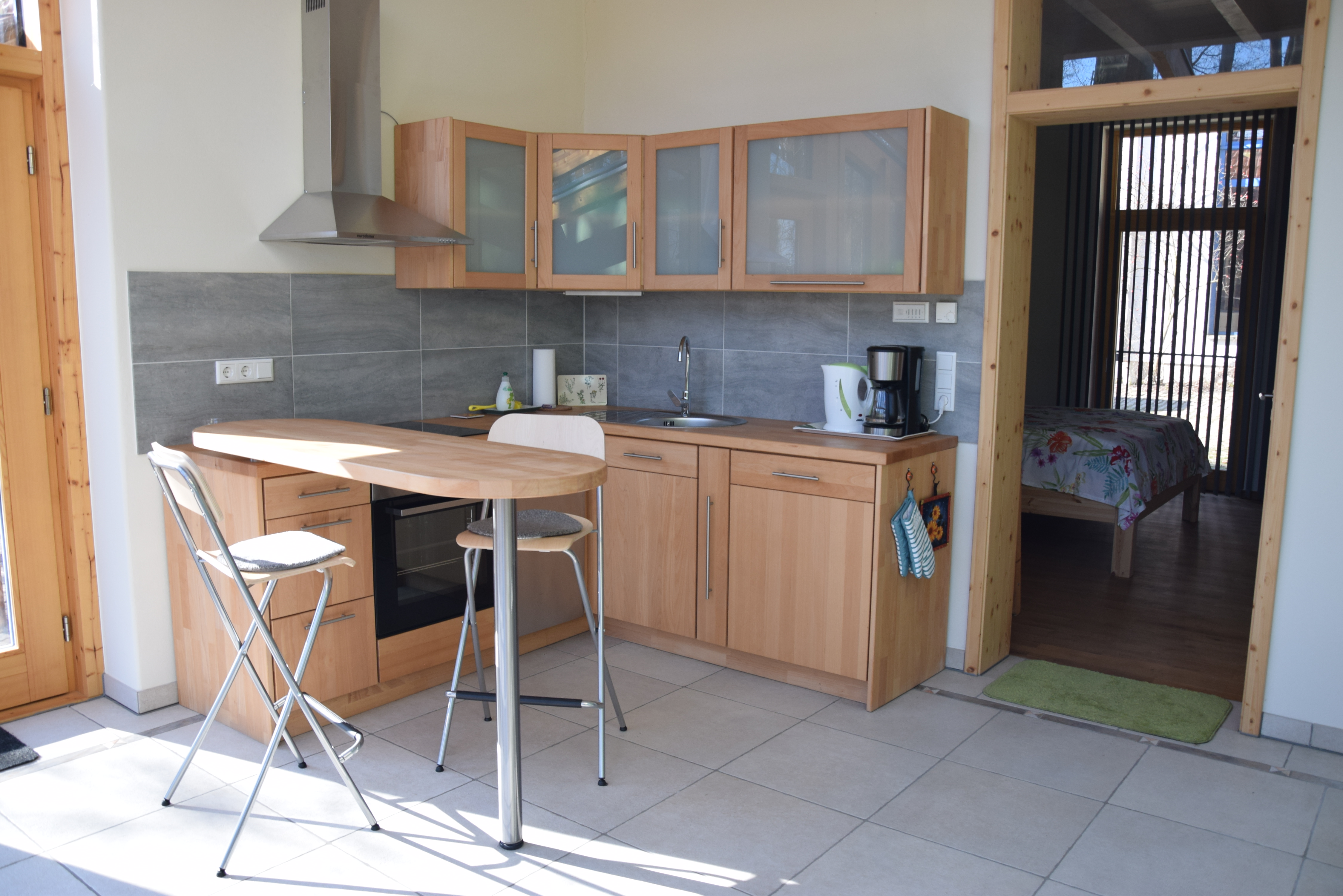 Unsere Ferienwohnung bietet Platz für bis zu 3 Personen und ist 42 m2 groß. Sie umfasst eine 16 m2 große Wohn-Küche, ein 15m2 großes Schlafzimmer, so wie ein Bad von 6 m2.